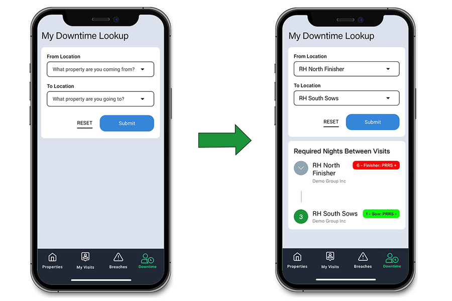 The Protocol Farm Visits app makes biosecurity easy for everyone, with automatic updates to downtime requirements and farm health status. The app offers two different visit planning tools to automate downtime – My Downtime Lookup and the Downtime Planner.
